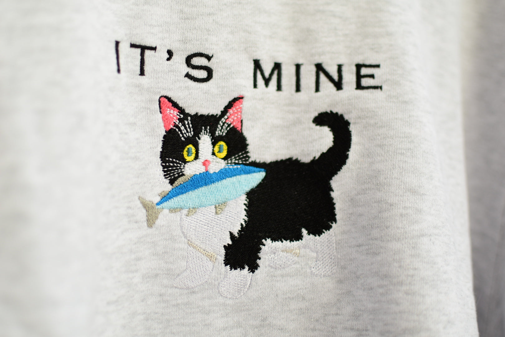 魚をくわえたハチワレねこちゃんを刺繍で描いた、