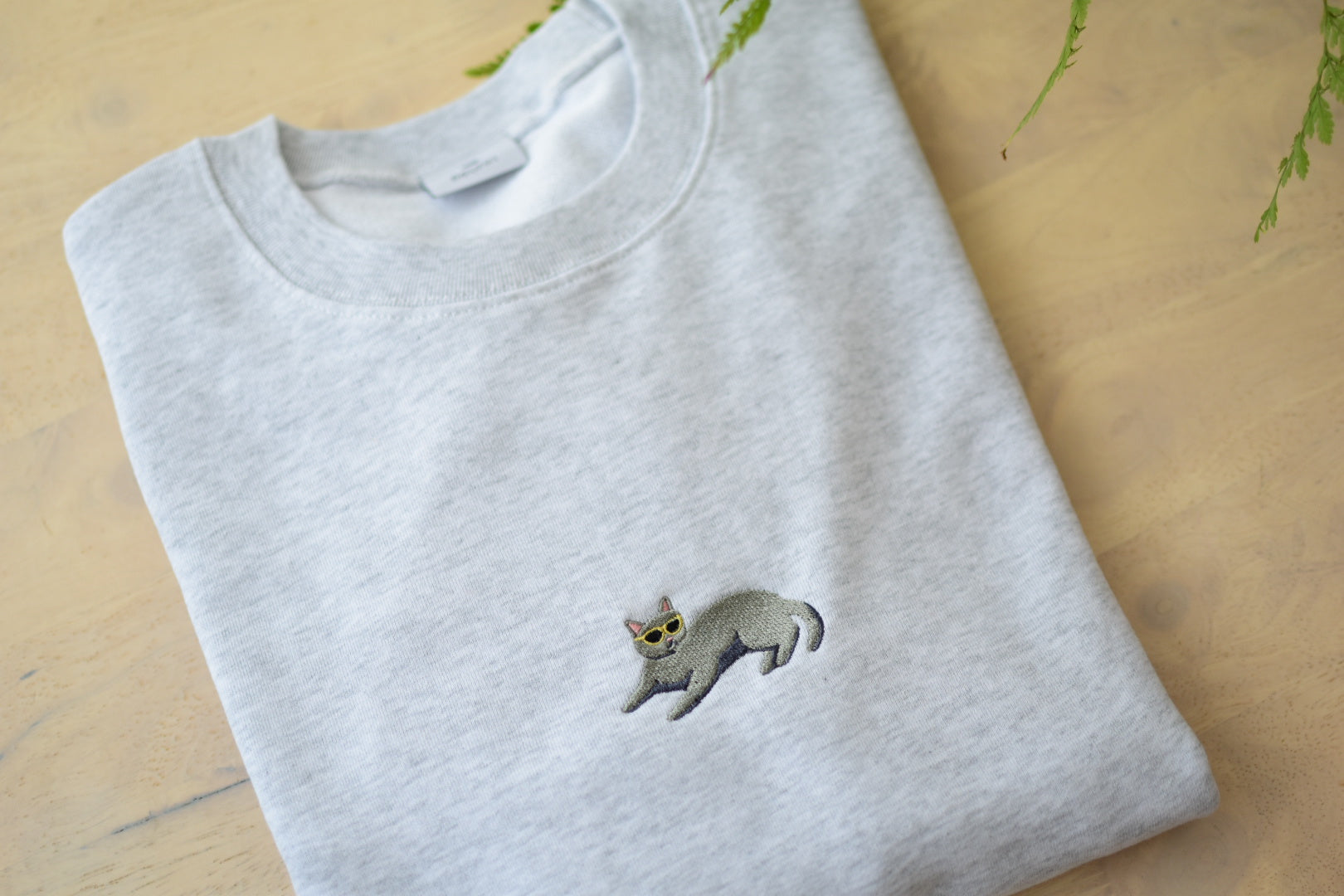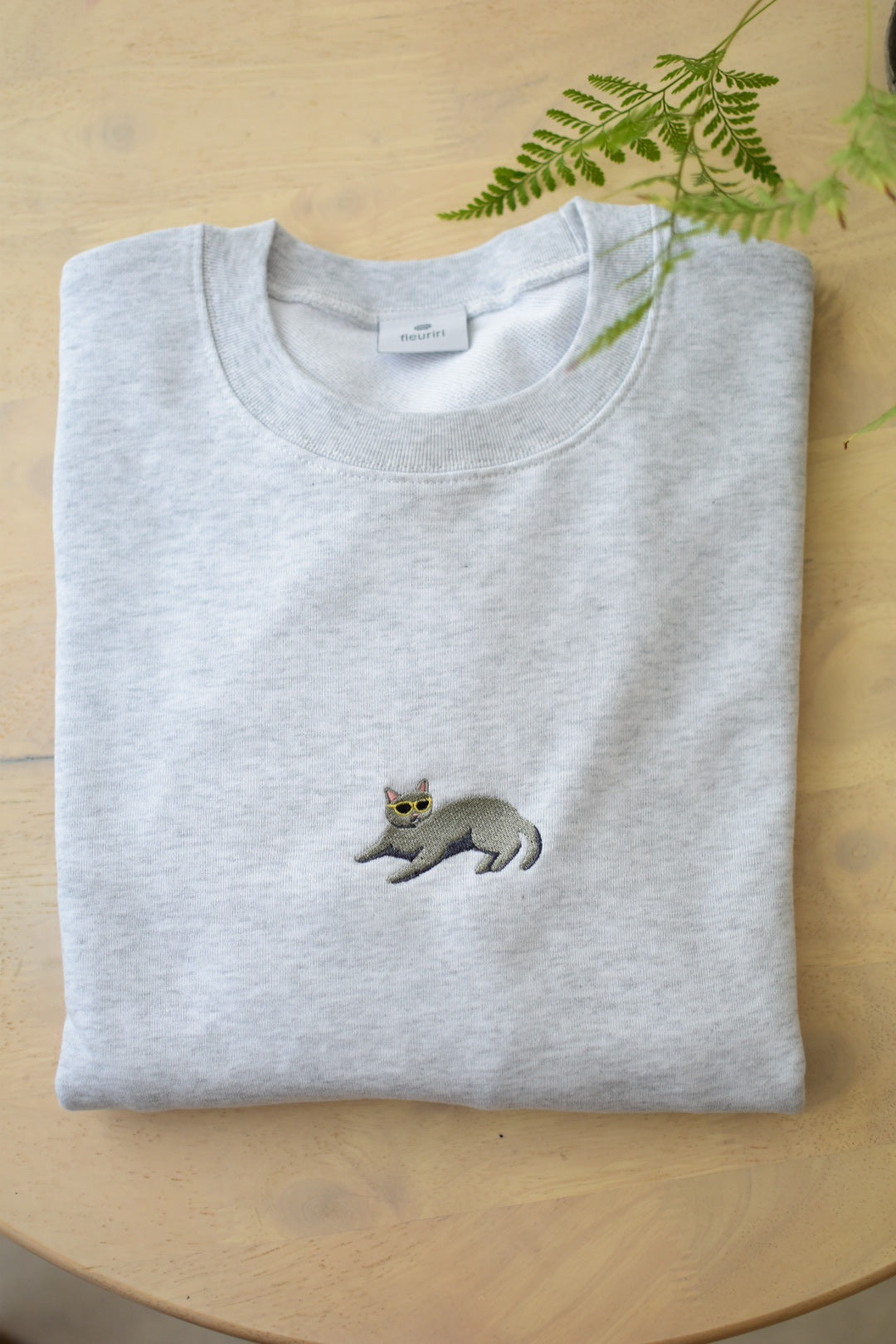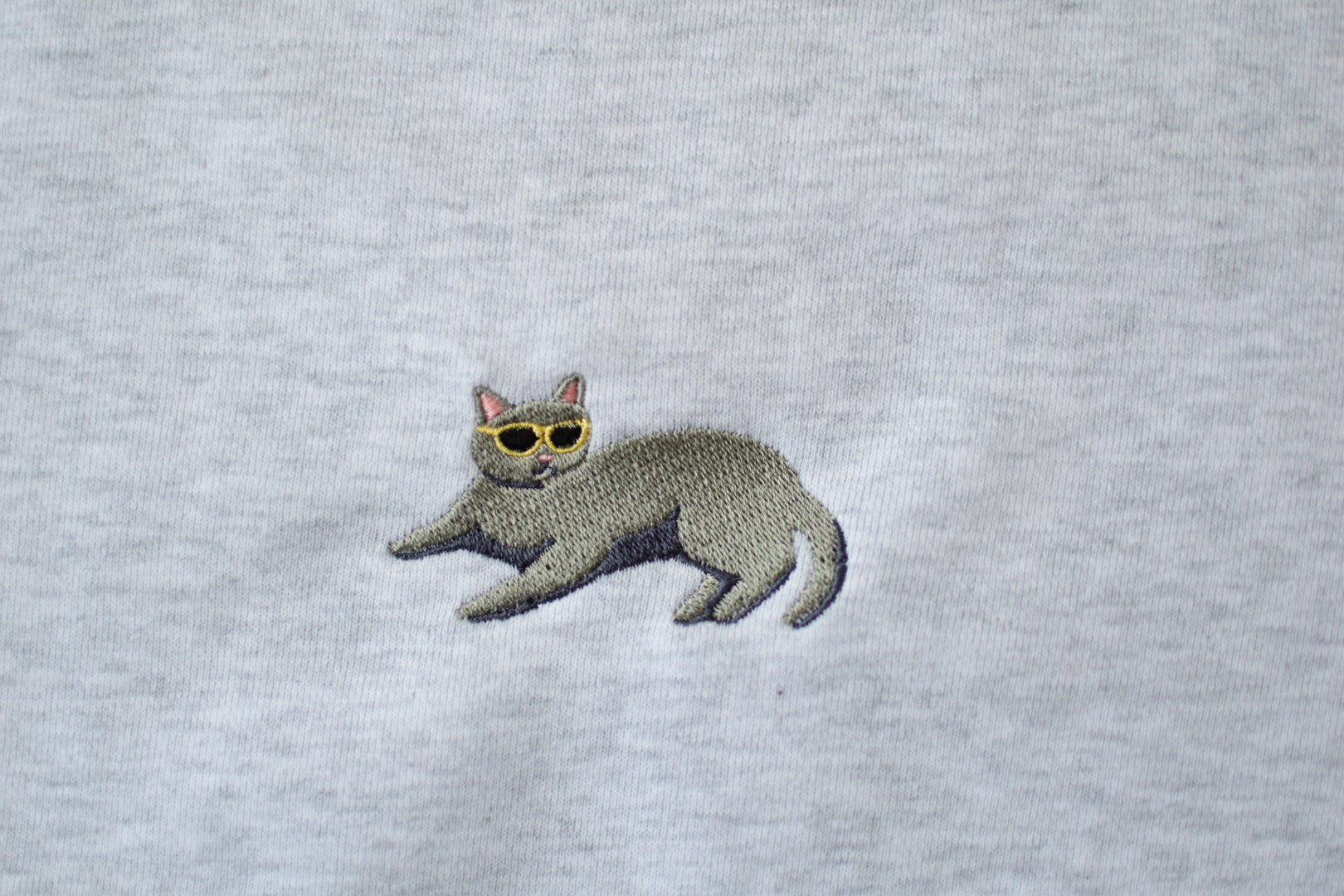 ちょこんとサングラスをかけた、リラックスポーズのねこちゃんのワンポイント刺繍がかわいいスウェットです。