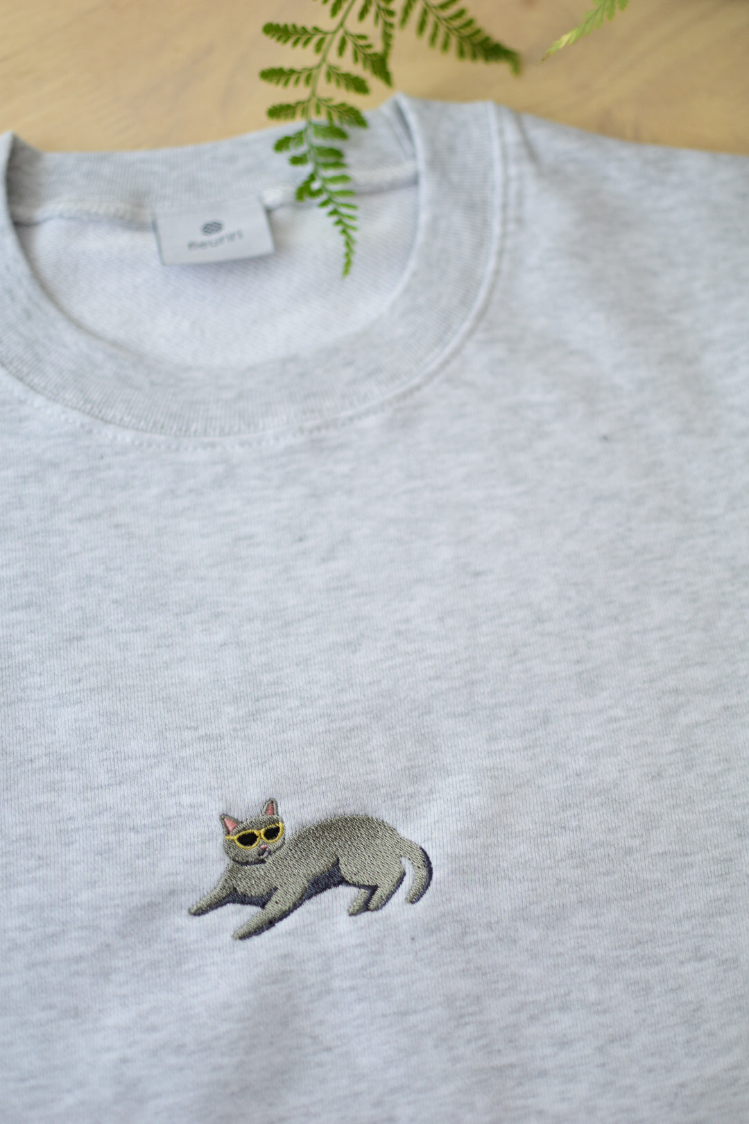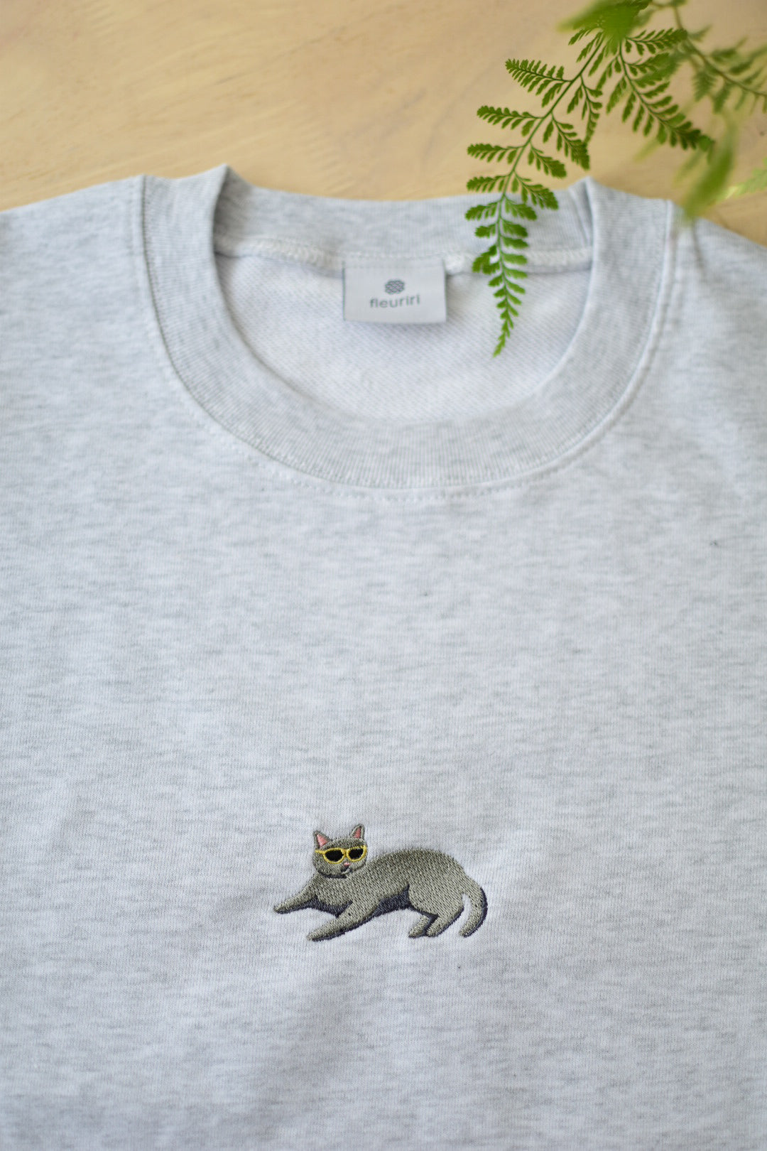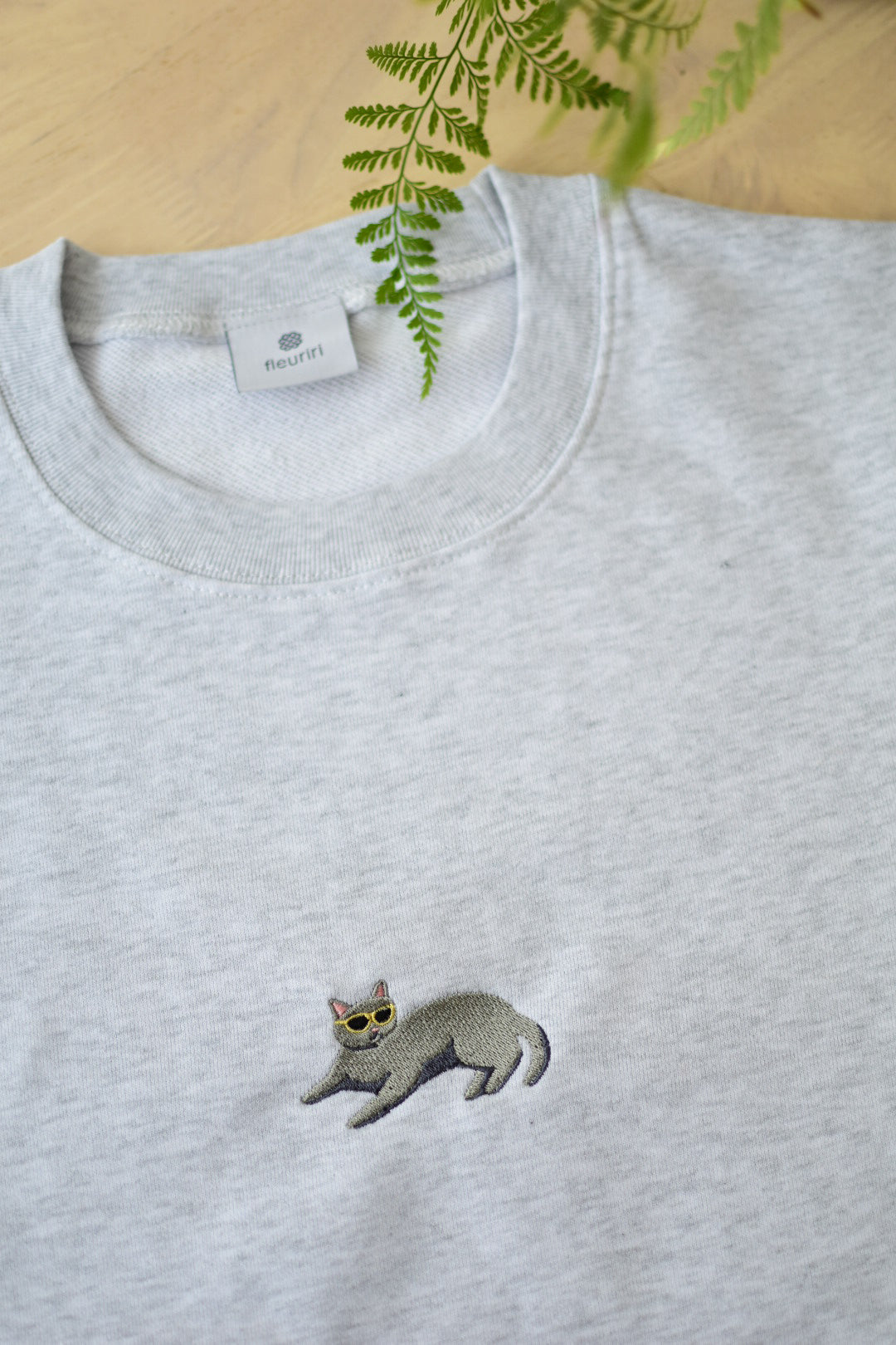 ちょこんとサングラスをかけた、リラックスポーズのねこちゃんのワンポイント刺繍がかわいいスウェットです。